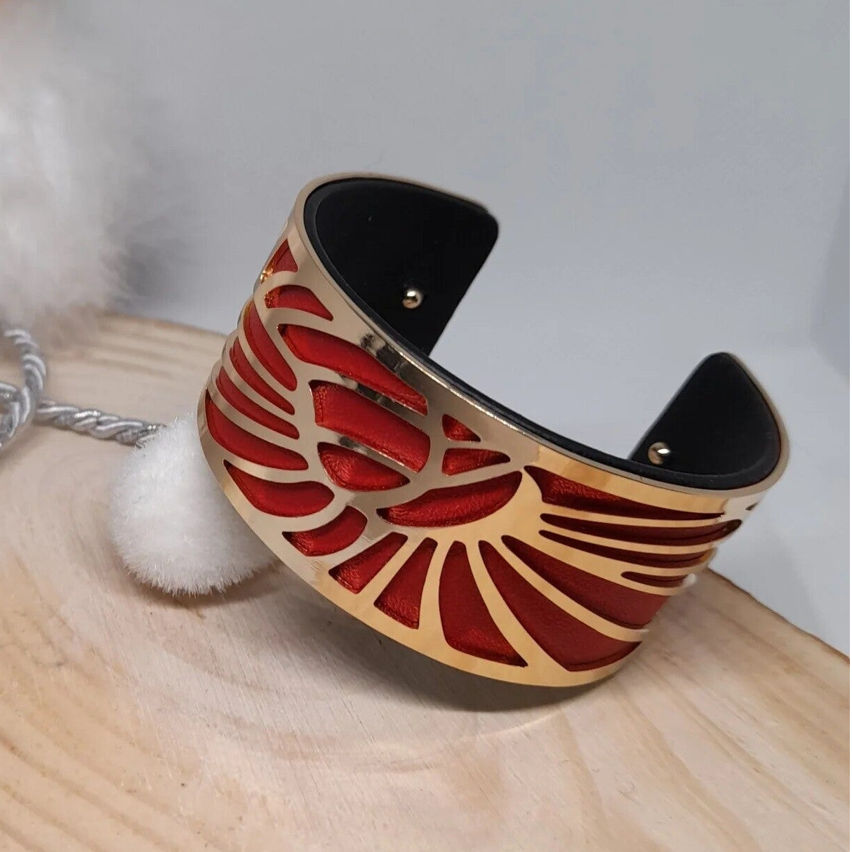 Les Tresors de Rubis vous offrent ce bracelet manchette en acier inoxydable, avec un intérieur en cuir synthétique amovible, dans deux couleurs.