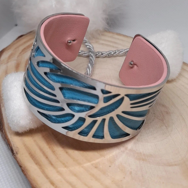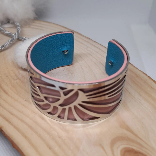 Les Tresors de Rubis vous offrent ce bracelet manchette en acier inoxydable, avec un intérieur en cuir synthétique amovible, dans deux couleurs.