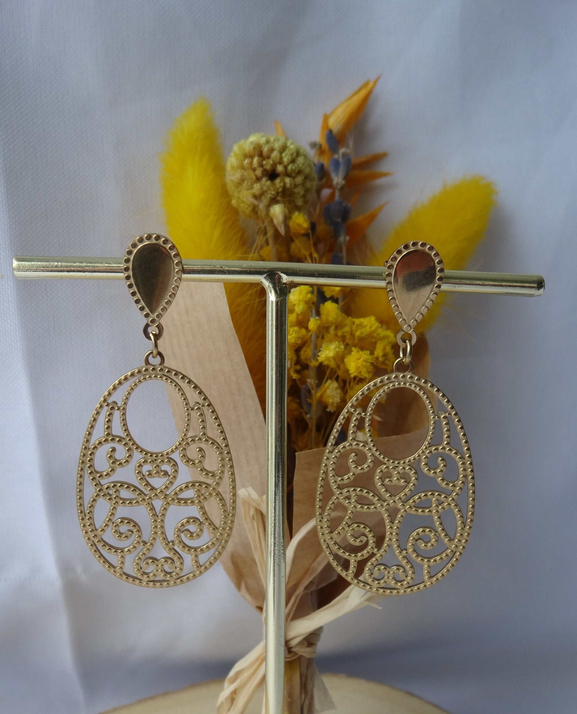 Boucles d'oreilles ovales ornées d'un motif doré.