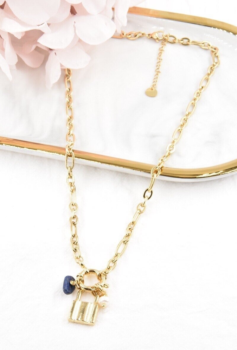 Les Trésors de rubis vous propose ce Collier avec Breloques ( Amovibles ) Cadenas une pierre de couleur et une pierre nacre en acier inoxydable.