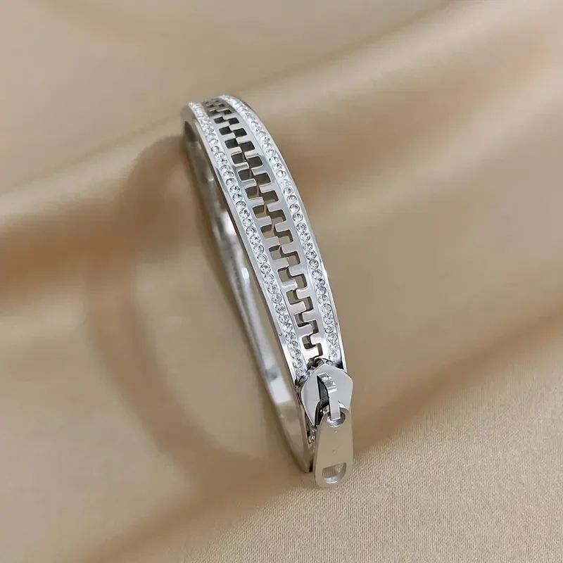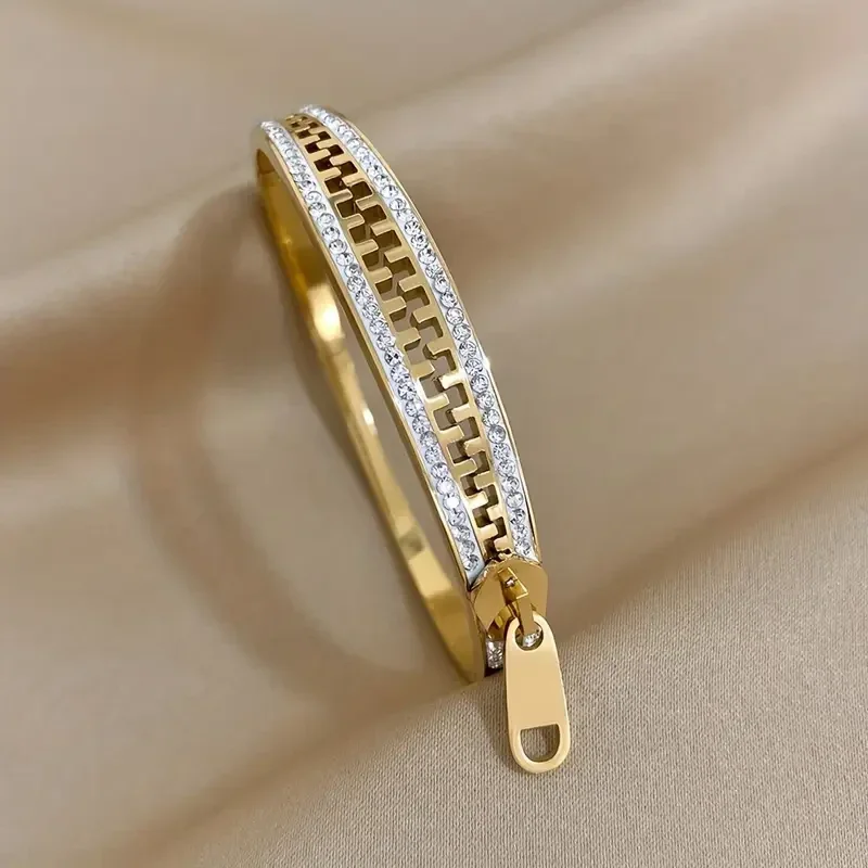 Les Trésors de Rubis vous propose ce Jolie Bracelet doré ou argenté effet fausse fermeture éclair ornée de strass en Acier Inoxydable.