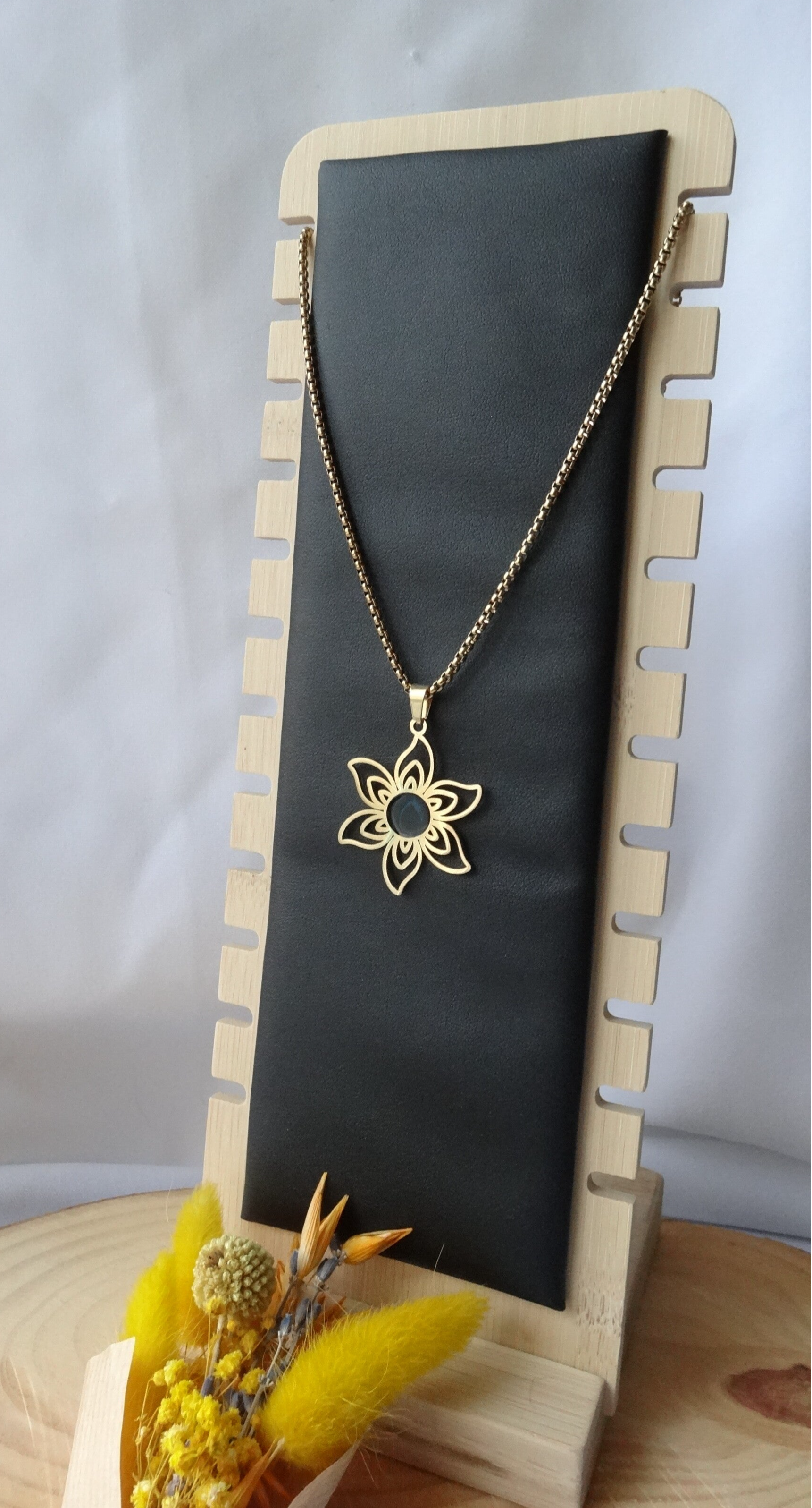 Long Collier doré orné d'une Fleur de Lotus avec Pierre Synthétique Noir
