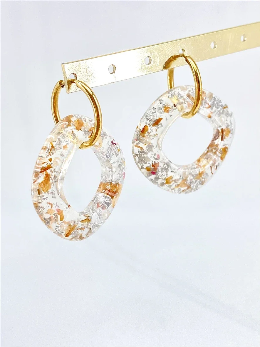 Anneaux en acier inoxydable et la pampille transparente ornées de paillettes argentées.