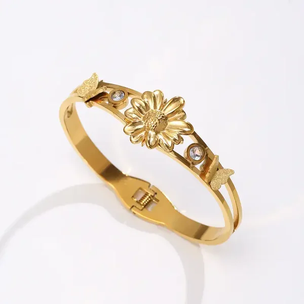 Les Trésors de Rubis vous propose ce Jolie Bracelet doré avec une fleur, des papillons et faux diamants en Acier Inoxydable.