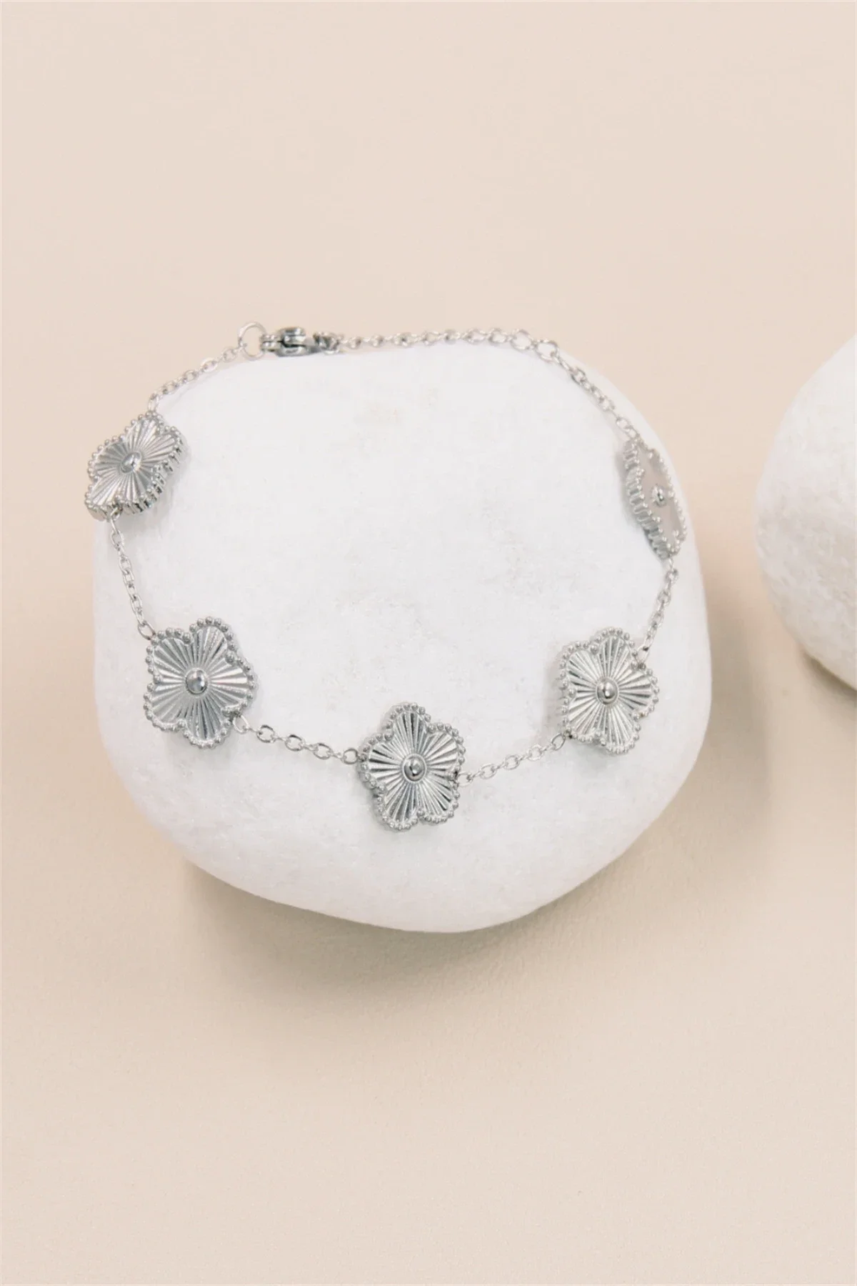 Il est composé de cinq charms en forme de trèfle, chacun étant finement détaillé avec des motifs en relief et une petite perle au centre. Les trèfles sont reliés par une chaîne délicate, et le bracelet se ferme avec un fermoir mousqueton. Le métal doré ajoute une touche de sophistication et de luxe, faisant de ce bracelet un accessoire parfait pour compléter une tenue chic ou pour offrir en cadeau.