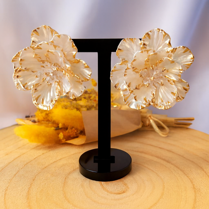 Les Trésors de Rubis vous propose c'est boucles d'Oreilles, en forme de fleur Blanche et Or en résine avec sa tige en acier inoxydable.