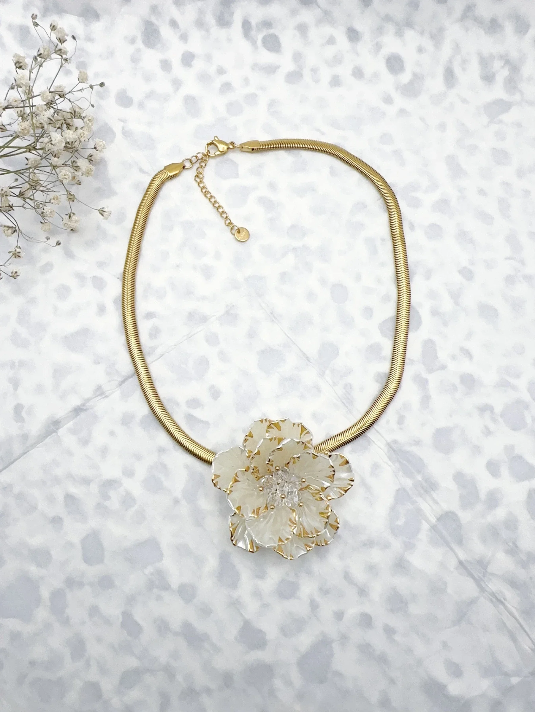 Les Trésors de Rubis vous propose ce collier en acier inoxydable doré, mettant en avant une fleur en résine blanche embellie d'or.