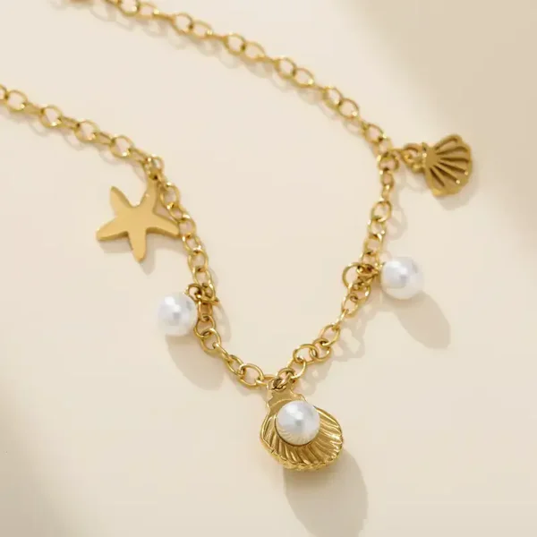 Cette Jolie Chaine de Cheville avec avec Coquillage, Etoile de Mer et perles blanches embelliront votre cheville.