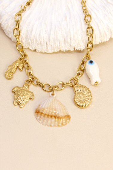 Plongez dans l’univers marin avec ce bracelet doré orné de charms emblématiques de la mer : tortue, hippocampe, coquillage naturel, poisson en céramique, ammonite, et œil protecteur bleu.